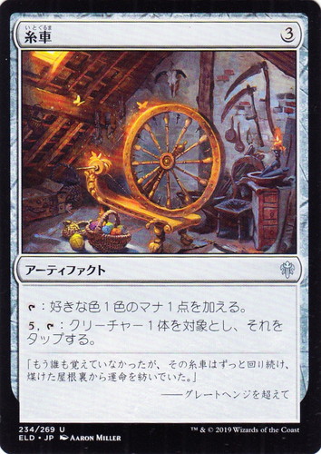 ![]() ![]() | ELD 234 糸車 アーティファクト エルドレインの王権 U 色:無色 マナコスト:(3) [T]:好きな色1色のマナ1点を加える。 (5), [T]:クリーチャー1体を対象とし、それをタップする。 「もう誰も覚えていなかったが、その糸車はずっと回り続け、煤けた屋根裏から運命を紡いでいた。」 ――グレートヘンジを超えて illust:AARON MILLER |