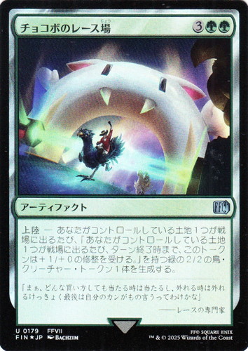 ![]() ![]() | FIN 0179 チョコボのレース場 アーティファクト FINAL FANTASY U(foil) 色:緑 マナコスト:(3)(緑)(緑) 上陸―あなたがコントロールしている土地1つが戦場に出るたび、「あなたがコントロールしている土地1つが戦場に出るたび、ターン終了時まで、このトークンは+1/+0の修整を受ける。」を持つ緑の2/2の鳥・クリーチャー・トークン1体を生成する。 「まぁ、どんな買い方しても当たる時は当たるし、外れる時は外れるけっきょくは最後は自分のカンがものを言うってわけかな」 ――レースの専門家 illust:BACHZIM 出典:FFVII |