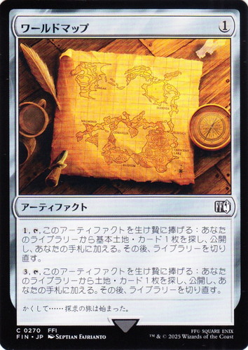 ![]() ![]() | FIN 0270 ワールドマップ アーティファクト FINAL FANTASY C 色:無色 マナコスト:(1) (1), [T], このアーティファクトを生け贄に捧げる:あなたのライブラリーから基本土地・カード1枚を探し、公開し、あなたの手札に加える。その後、ライブラリーを切り直す。 (3), [T], このアーティファクトを生け贄に捧げる:あなたのライブラリーから土地・カードを探し、公開し、あなたの手札に加える。その後、ライブラリーを切り直す。 かくして・・・・・・探求の旅は始まった。 illust:SEPTIAN FAJRIANTO 出典:FFI |