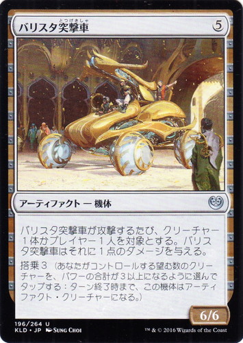 ![]() ![]() | KLD 196 バリスタ突撃車 アーティファクト カラデシュ U 色:無色 サブタイプ:機体 マナコスト:(5) パワー:6 タフネス:6 バリスタ突撃車が攻撃するたび、クリーチャー1体かプレイヤー1人を対象とする。バリスタ突撃車はそれに1点のダメージを与える。 搭乗3(あなたがコントロールする望む数のクリーチャーを、パワーの合計が3以上になるように選んでタップする:ターン終了時まで、この機体はアーティファクト・クリーチャーになる。) illust:SUNG CHOI |
