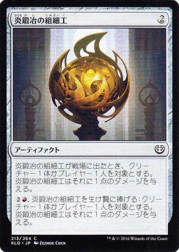 ![]() ![]() | KLD 213 炎鍛冶の組細工 アーティファクト カラデシュ C 色:無色 マナコスト:(2) 炎鍛冶の組細工が戦場に出たとき、クリーチャー1体かプレイヤー1人を対象とする。炎鍛冶の組細工はそれに1点のダメージを与える。 (2)(赤), 炎鍛冶の組細工を生け贄に捧げる:クリーチャー1体かプレイヤー1人を対象とする。炎鍛冶の組細工はそれに1点のダメージを与える。 illust:ZEZHOU CHEN |