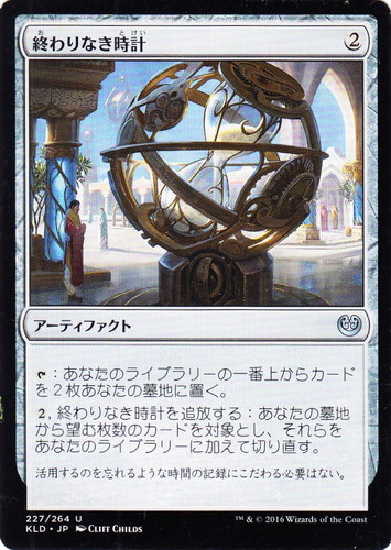 ![]() ![]() | KLD 227 終わりなき時計 アーティファクト カラデシュ U 色:無色 マナコスト:(2) [T]:あなたのライブラリーの一番上からカードを2枚あなたの墓地に置く。 (2), 終わりなき時計を追放する:あなたの墓地から望む枚数のカードを対象とし、それらをあなたのライブラリーに加えて切り直す。 活用するのを忘れるような時間の記録にこだわる必要はない。 illust:CLIFF CHILDS |