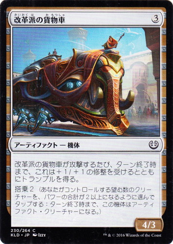 ![]() ![]() | KLD 230 改革派の貨物車 アーティファクト カラデシュ C 色:無色 サブタイプ:機体 マナコスト:(3) パワー:4 タフネス:3 改革派の貨物車が攻撃するたび、ターン終了時まで、これは+1/+1の修整を受けるとともにトランプルを得る。 搭乗2(あなたがコントロールする望む数のクリーチャーを、パワーの合計が2以上になるように選んでタップする:ターン終了時まで、この機体はアーティファクト・クリーチャーになる。) illust:IZZY |
