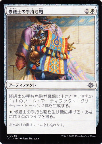 ![]() ![]() | LCI 0040 修繕士の手持ち鞄 アーティファクト イクサラン:失われし洞窟 C 色:白 マナコスト:(2)(白) 修繕士の手持ち鞄が戦場に出たとき、無色の1/1のノーム・アーティファクト・クリーチャー・トークン2体を生成する。 (白), 修繕士の手持ち鞄を生け贄に捧げる:あなたは3点のライフを得る。 お出かけの際はノームをお忘れなく。 illust:JULIA METZGER |