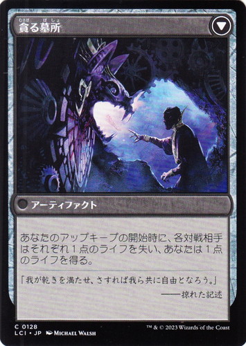 ![]() ![]() | LCI 0128 貪る墓所 アーティファクト イクサラン:失われし洞窟 C 色:黒 あなたのアップキープの開始時に、各対戦相手はそれぞれ1点のライフを失い、あなたは1点のライフを得る。 両面:税血の刃 「我が乾きを満たせ、さすれば我ら共に自由となろう。」 ――掠れた記述 illust:MICHAEL WALSH |