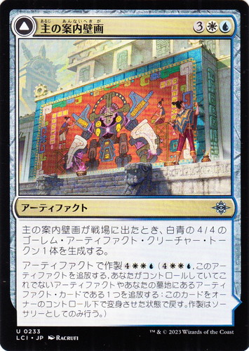 ![]() ![]() | LCI 0233 主の案内壁画 アーティファクト イクサラン:失われし洞窟 U 色:白/青 マナコスト:(3)(白)(青) 主の案内壁画が戦場に出たとき、白青の4/4のゴーレム・アーティファクト・クリーチャー・トークン1体を生成する。 アーティファクトで作製(4)(白)(白)(青)((4)(白)(白)(青), このアーティファクトを追放する, あなたがコントロールしていてこれでないアーティファクトやあなたの墓地にあるアーティファクト・カードである1つを追放する:このカードをオーナーのコントロール下で変身させた状態で戻す。作製はソーサリーとしてのみ行う。) 両面:主の組立工廠 illust:RACRUFI |
