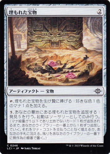 ![]() ![]() | LCI 0246 埋もれた宝物 アーティファクト イクサラン:失われし洞窟 C 色:無色 サブタイプ:宝物 マナコスト:(2) [T], 埋もれた宝物を生け贄に捧げる:好きな色1色のマナ1点を加える。 (5), あなたの墓地にある埋もれた宝物を追放する:発見5を行う。起動はソーサリーとしてのみ行う。(マナ総量が5以下であり土地でないカード1枚が追放されるまで、あなたのライブラリーの一番上から1枚ずつ追放していく。それをマナ・コストを支払うことなく唱えるか、あなたの手札に加える。残りをあなたのライブラリーの一番下に無作為の順番で置く。) illust:JAREL THREAT |