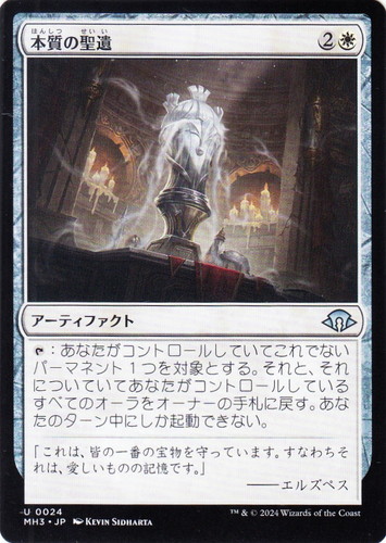 ![]() ![]() | MH3 0024 本質の聖遺 アーティファクト モダンホライゾン3 U 色:白 マナコスト:(2)(白) [T]:あなたがコントロールしていてこれでないパーマネント1つを対象とする。それと、それについていてあなたがコントロールしているすべてのオーラをオーナーの手札に戻す。あなたのターン中にしか起動できない。 「これは、皆の一番の宝物を守っています。すなわちそれは、愛しいものの記憶です。」 ――エルズペス illust:KEVIN SIDHARTA |