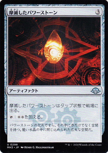 ![]() ![]() | MH3 0298 摩滅したパワーストーン アーティファクト モダンホライゾン3 U 色:無色 マナコスト:(3) 透かしシンボル:ウルザズ・サーガ 摩滅したパワーストーンはタップ状態で戦場に出る。 [T]:(無)(無)を加える。 パワーストーンの欠片ですら、その中に力だけでなく空間を持つ。脆い水晶の中に閉じ込められた広大な空間だ。 illust:HENRY G. HIGGINBOTHAM |