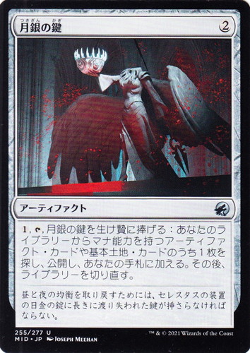 ![]() ![]() | MID 255 月銀の鍵 アーティファクト イニストラード:真夜中の狩り U 色:無色 マナコスト:(2) (1), [T], 月銀の鍵を生け贄に捧げる:あなたのライブラリーからマナ能力を持つアーティファクト・カードや基本土地・カードのうち1枚を探し、公開し、あなたの手札に加える。その後、ライブラリーを切り直す。 昼と夜の均衡を取り戻すためには、セレスタスの装置の日金の錠に長きに渡り失われた鍵が挿さらなければならない。 illust:JOSEPH MEEHAN |