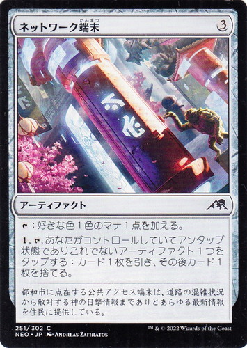 ![]() ![]() | NEO 251 ネットワーク端末 アーティファクト 神河:輝ける世界 C 色:無色 マナコスト:(3) [T]:好きな色1色のマナ1点を加える。 (1), [T], あなたがコントロールしていてアンタップ状態でありこれでないアーティファクト1つをタップする:カード1枚を引き、その後カード1枚を捨てる。 都和市に点在する公共アクセス端末は、道路の混雑状況から敵対する神の目撃情報までありとあらゆる最新情報を住民に提供している。 illust:ANDREAS ZAFIRATOS |