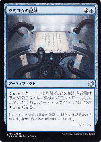 ![]() ![]() | ONE 070 タミヨウの記録 アーティファクト ファイレクシア:完全なる統一 U 色:青 マナコスト:(2)(青) (5)(青), [T]:カード1枚を引く。この能力を起動するためのコストは、あなたがコントロールしていてこれでないアーティファクト1つにつき(1)少なくなる。 「ファイレクシアの真実の物語に、新たな章が開かれるのです。後世に向け誰かが記録しなければ。」 ――タミヨウ illust:PIOTR DURA |