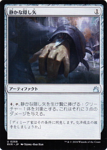 ![]() ![]() | RVR 0268 静かな隠し矢 アーティファクト ラヴニカ・リマスター U 色:無色 マナコスト:(1) (4), [T], 静かな隠し矢を生け贄に捧げる:クリーチャー1体を対象とする。これはそれに3点のダメージを与える。 「ディミーア家はその条件に同意します。交渉成立の握手をしましょうか。」 illust:YEONG-HAO HAN |