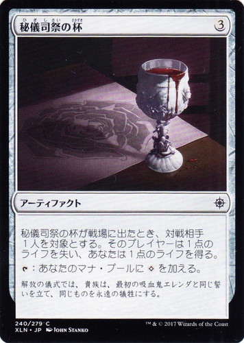 ![]() ![]() | XLN 240 秘儀司祭の杯 アーティファクト イクサラン C 色:無色 マナコスト:(3) 秘儀司祭の杯が戦場に出たとき、対戦相手1人を対象とする。そのプレイヤーは1点のライフを失い、あなたは1点のライフを得る。 [T]:あなたのマナ・プールに(無)を加える。 解放の儀式では、貴族は、最初の吸血鬼エレンダと同じ誓いを立て、同じものを永遠の犠牲にする。 illust:JOHN STANKO |