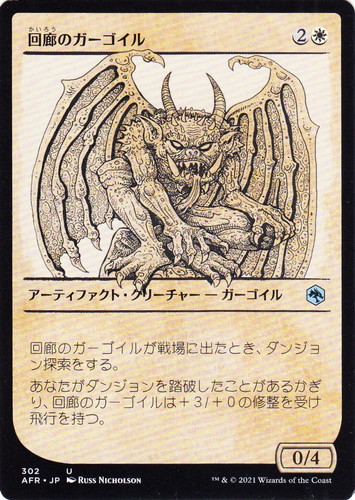 ![]() ![]() | AFR 302 回廊のガーゴイル アーティファクト・クリーチャー フォーゴトン・レルム探訪 U 色:白 サブタイプ:ガーゴイル マナコスト:(2)(白) パワー:0 タフネス:4 回廊のガーゴイルが戦場に出たとき、ダンジョン探索をする。 あなたがダンジョンを踏破したことがあるかぎり、回廊のガーゴイルは+3/+0の修整を受け飛行を持つ。 illust:RUSS NICHOLSON |