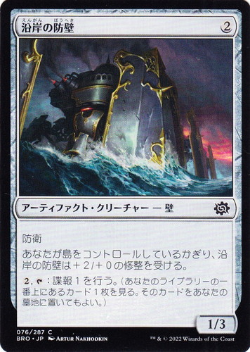 ![]() ![]() | BRO 076 沿岸の防壁 アーティファクト・クリーチャー 兄弟戦争 C 色:無色 サブタイプ:壁 マナコスト:(2) パワー:1 タフネス:3 防衛 あなたが島をコントロールしているかぎり、沿岸の防壁は+2/+0の修整を受ける。 (2), [T]:諜報1を行う。(あなたのライブラリーの一番上にあるカード1枚を見る。そのカードをあなたの墓地に置いてもよい。) illust:ARTUR NAKHODKIN |