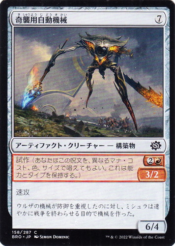 ![]() ![]() | BRO 158 奇襲用自動機械 アーティファクト・クリーチャー 兄弟戦争 C 色:無色 サブタイプ:構築物 マナコスト:(7) パワー:6 タフネス:4 試作(あなたはこの呪文を、異なるマナ・コスト、色、サイズで唱えてもよい。これは能力とタイプを保持する。) (2)(赤) 3/2 速攻 ウルザの機械が防御を重視したのに対し、ミシュラは速やかに戦争を終わらせる目的で機械を作った。 illust:SIMON DOMINIC |