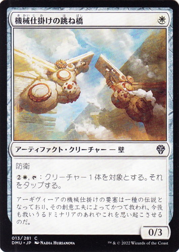 ![]() ![]() | DMU 013 機械仕掛けの跳ね橋 アーティファクト・クリーチャー 団結のドミナリア C 色:白 サブタイプ:壁 マナコスト:(白) パワー:0 タフネス:3 防衛 (2)(白), [T]:クリーチャー1体を対象とする。それをタップする。 アーギヴィーアの機械仕掛けの要塞は一種の伝説となっており、その創意工夫によってかつて救われ、今後も救いうるドミナリアのあれやこれを思い起こさせるのだ。 illust:NADIA HURIANOVA |