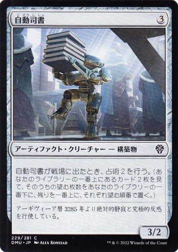 ![]() ![]() | DMU 229 自動司書 アーティファクト・クリーチャー 団結のドミナリア C 色:無色 サブタイプ:構築物 マナコスト:(3) パワー:3 タフネス:2 自動司書が戦場に出たとき、占術2を行う。(あなたのライブラリーの一番上にあるカード2枚を見て、そのうち望む枚数をあなたのライブラリーの一番下に、残りを一番上に、それぞれ望む順番で置く。) アーギヴィーア暦3285年より絶対的静寂と究極的反感を行使している。 illust:ALEX KONSTAD |