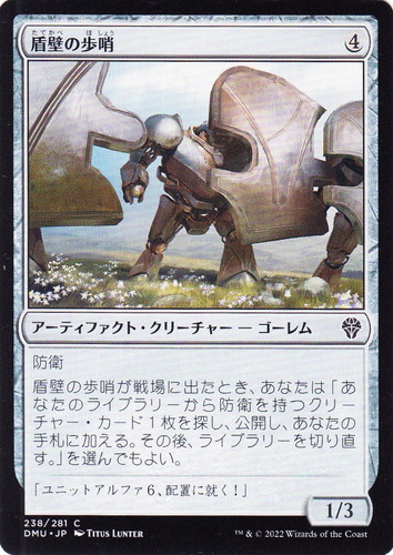 ![]() ![]() | DMU 238 盾壁の歩哨 アーティファクト・クリーチャー 団結のドミナリア C 色:無色 サブタイプ:ゴーレム マナコスト:(4) パワー:1 タフネス:3 防衛 盾壁の歩哨が戦場に出たとき、あなたは「あなたのライブラリーから防衛を持つクリーチャー・カード1枚を探し、公開し、あなたの手札に加える。その後、ライブラリーを切り直す。」を選んでもよい。 「ユニットアルファ6、配置に就く!」 illust:TITUS LUNTER |
