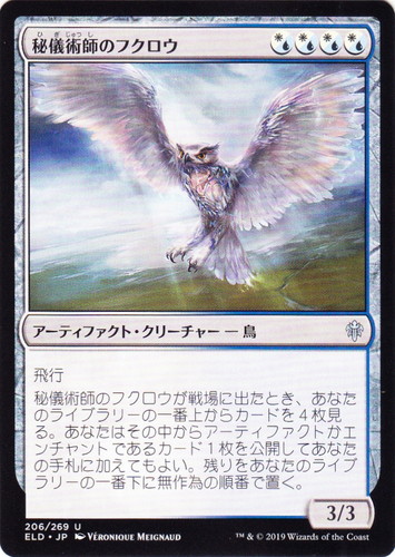 ![]() ![]() | ELD 206 秘儀術師のフクロウ アーティファクト・クリーチャー エルドレインの王権 U 色:白/青 サブタイプ:鳥 マナコスト:(白/青)(白/青)(白/青)(白/青) パワー:3 タフネス:3 飛行 秘儀術師のフクロウが戦場に出たとき、あなたのライブラリーの一番上からカードを4枚見る。あなたはその中からアーティファクトかエンチャントであるカード1枚を公開してあなたの手札に加えてもよい。残りをあなたのライブラリーの一番下に無作為の順番で置く。 illust:VERONIQUE MEIGNAUD |