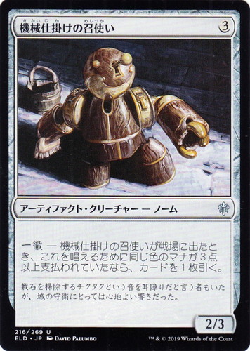 ![]() ![]() | ELD 216 機械仕掛けの召使い アーティファクト・クリーチャー エルドレインの王権 U 色:無色 サブタイプ:ノーム マナコスト:(3) パワー:2 タフネス:3 一徹―機械仕掛けの召使いが戦場に出たとき、これを唱えるために同じ色のマナが3点以上支払われていたなら、カードを1枚引く。 敷石を掃除するチクタクという音を耳障りだと言う者もいたが、城の守衛にとっては心地よい響きだった。 illust:DAVID PALUMBO |
