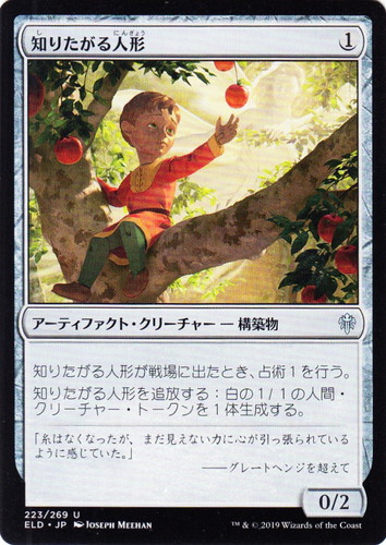 ![]() ![]() | ELD 223 知りたがる人形 アーティファクト・クリーチャー エルドレインの王権 U 色:無色 サブタイプ:構築物 マナコスト:(1) パワー:0 タフネス:2 知りたがる人形が戦場に出たとき、占術1を行う。 知りたがる人形を追放する:白の1/1の人間・クリーチャー・トークンを1体生成する。 「糸はなくなったが、まだ見えない力に心が引っ張られているように感じていた。」 ――グレートヘンジを超えて illust:JOSEPH MEEHAN |