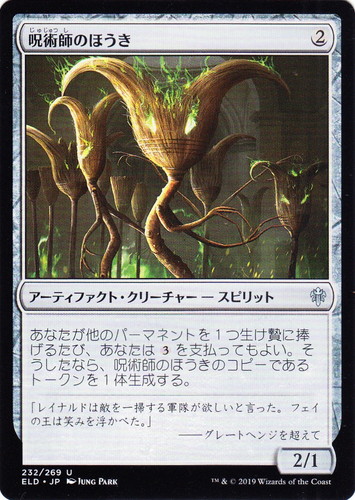 ![]() ![]() | ELD 232 呪術師のほうき アーティファクト・クリーチャー エルドレインの王権 U 色:無色 サブタイプ:スピリット マナコスト:(2) パワー:2 タフネス:1 あなたが他のパーマネントを1つ生け贄に捧げるたび、あなたは(3)を支払ってもよい。そうしたなら、呪術師のほうきのコピーであるトークンを1体生成する。 「レイナルドは敵を一掃する軍隊が欲しいと言った。フェイの王は笑みを浮かべた。」 ――グレートヘンジを超えて illust:JUNG PARK |