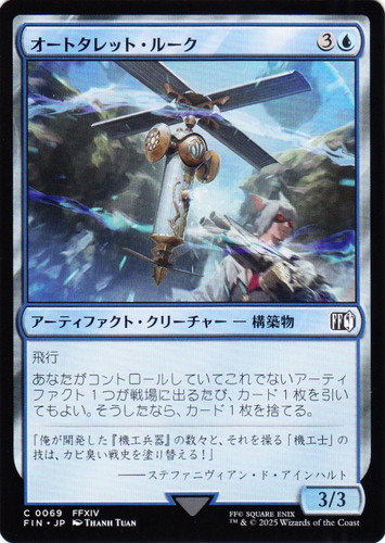 ![]() ![]() | FIN 0069 オートタレット・ルーク アーティファクト・クリーチャー FINAL FANTASY C 色:青 サブタイプ:構築物 マナコスト:(3)(青) パワー:3 タフネス:3 飛行 あなたがコントロールしていてこれでないアーティファクト1つが戦場に出るたび、カード1枚を引いてもよい。そうしたなら、カード1枚を捨てる。 「俺が開発した『機工兵器』の数々と、それを操る「機工士」の技は、カビ臭い戦史を塗り替える!」 ――ステファニヴィアン・ド・アインハルト illust:THANH TUAN 出典:FFXIV |
