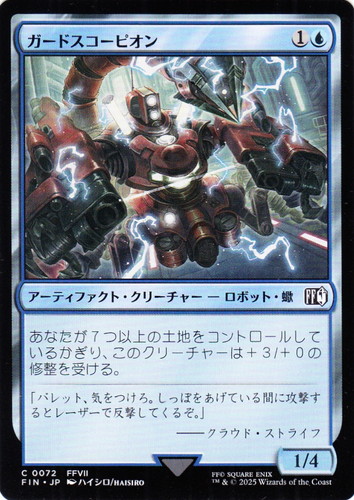 ![]() ![]() | FIN 0072 ガードスコーピオン アーティファクト・クリーチャー FINAL FANTASY C 色:青 サブタイプ:ロボット・蠍 マナコスト:(1)(青) パワー:1 タフネス:4 あなたが7つ以上の土地をコントロールしているかぎり、このクリーチャーは+3/+0の修整を受ける。 「バレット、気をつけろ。しっぽをあげている間に攻撃するとレーザーで反撃してくるぞ。」 ――クラウド・ストライフ illust:ハイシロ/HAISIRO 出典:FFVII |