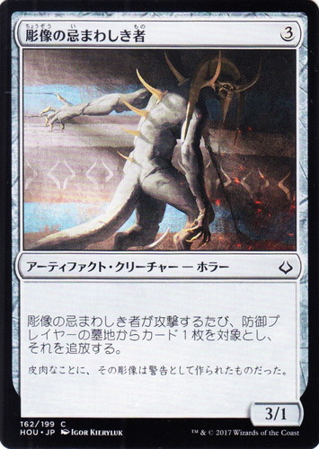 ![]() ![]() | HOU 162 彫像の忌まわしき者 アーティファクト・クリーチャー 破滅の刻 C 色:無色 サブタイプ:ホラー マナコスト:(3) パワー:3 タフネス:1 彫像の忌まわしき者が攻撃するたび、防御プレイヤーの墓地からカード1枚を対象とし、それを追放する。 皮肉なことに、その彫像は警告として作られたものだった。 illust:IGOR KIERYLUK |