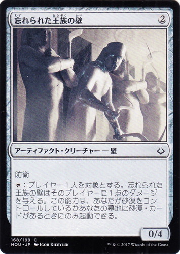 ![]() ![]() | HOU 168 忘れられた王族の壁 アーティファクト・クリーチャー 破滅の刻 C 色:無色 サブタイプ:壁 マナコスト:(2) パワー:0 タフネス:4 防衛 [T]:プレイヤー1人を対象とする。忘れられた王族の壁はそのプレイヤーに1点のダメージを与える。この能力は、あなたが砂漠をコントロールしているかあなたの墓地に砂漠・カードがあるときにのみ起動できる。 illust:IGOR KIERYLUK |