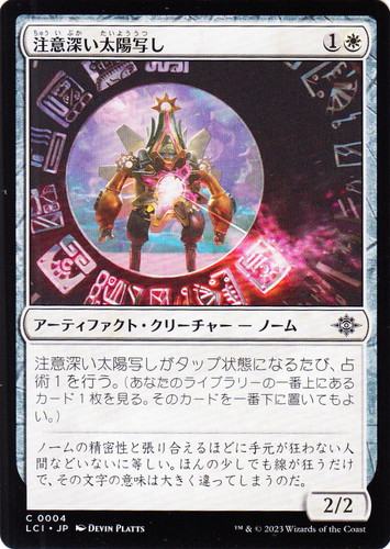 ![]() ![]() | LCI 0004 注意深い太陽写し アーティファクト・クリーチャー イクサラン:失われし洞窟 C 色:白 サブタイプ:ノーム マナコスト:(1)(白) パワー:2 タフネス:2 注意深い太陽写しがタップ状態になるたび、占術1を行う。(あなたのライブラリーの一番上にあるカード1枚を見る。そのカードを一番下に置いてもよい。) ノームの精密性と張り合えるほどに手元が狂わない人間などいないに等しい。ほんの少しでも線が狂うだけで、その文字の意味は大きく違ってしまうのだ。 illust:DEVIN PLATTS |