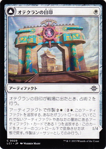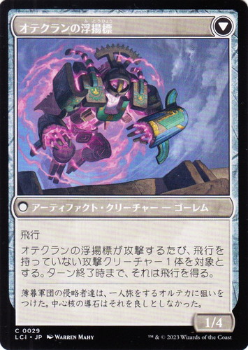 ![]() ![]() | LCI 0029 オテクランの浮揚標 アーティファクト・クリーチャー イクサラン:失われし洞窟 C 色:白 サブタイプ:ゴーレム パワー:1 タフネス:4 飛行 オテクランの浮揚標が攻撃するたび、飛行を持っていない攻撃クリーチャー1体を対象とする。ターン終了時まで、それは飛行を得る。 両面:オテクランの目印 薄暮軍団の侵略者達は、一人旅をするオルテカに狙いをつけた。中心核の導石はそれを良しとしなかった。 illust:WARREN MAHY |