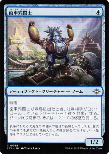 ![]() ![]() | LCI 0049 歯車式闘士 アーティファクト・クリーチャー イクサラン:失われし洞窟 C 色:青 サブタイプ:ノーム マナコスト:(青) パワー:1 タフネス:2 瞬速 歯車式闘士が戦場に出たとき、対戦相手がコントロールしているクリーチャー1体を対象とする。ターン終了時まで、それは-2/-0の修整を受ける。 長年にわたる大海原での冒険や逆境の経験を以てしても、背丈の半分にも満たない機械人形との練習試合に負けるという屈辱をブログは覚悟していなかった。 illust:TOMEK LAREK |
