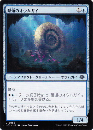 ![]() ![]() | LCI 0058 隠遁のオウムガイ アーティファクト・クリーチャー イクサラン:失われし洞窟 C 色:青 サブタイプ:オウムガイ マナコスト:(1)(青) パワー:1 タフネス:4 警戒 (1)(青):ターン終了時まで、隠遁のオウムガイは+3/-3の修整を受ける。 貝の元の持ち主はとうの昔に食われていた。そろそろ新しい住処と獲物を探す頃合いを見計らっていた。 illust:LOGAN FELICIANO |