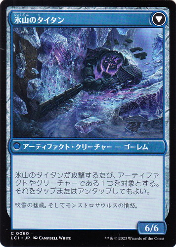 ![]() ![]() | LCI 0060 氷山のタイタン アーティファクト・クリーチャー イクサラン:失われし洞窟 C 色:青 サブタイプ:ゴーレム パワー:6 タフネス:6 氷山のタイタンが攻撃するたび、アーティファクトやクリーチャーである1つを対象とする。それをタップまたはアンタップしてもよい。 両面:反転された氷山 吹雪の猛威。そしてモンストロサウルスの憤怒。 illust:CAMPBELL WHITE |