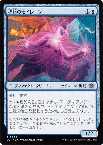 ![]() ![]() | LCI 0066 樫材のセイレーン アーティファクト・クリーチャー イクサラン:失われし洞窟 C 色:青 サブタイプ:セイレーン・海賊 マナコスト:(1)(青) パワー:1 タフネス:2 飛行、警戒 [T]:(青)を加える。このマナは、アーティファクト・呪文を唱えるためか、アーティファクトである発生源の能力を起動するためにしか支払えない。 船大工は船首像に小さなコズミュームの宝石を仕込んだ。まさかそのせいで船首像が飛んでいってしまうとは夢にも思わなかっただろう。 illust:LARS GRANT-WEST |