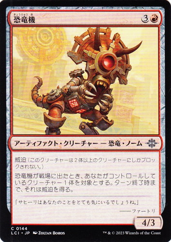 ![]() ![]() | LCI 0144 恐竜機 アーティファクト・クリーチャー イクサラン:失われし洞窟 C 色:赤 サブタイプ:恐竜・ノーム マナコスト:(3)(赤) パワー:4 タフネス:3 威迫(このクリーチャーは2体以上のクリーチャーにしかブロックされない。) 恐竜機が戦場に出たとき、あなたがコントロールしているクリーチャー1体を対象とする。ターン終了時まで、それは威迫を得る。 「サヒーリはあなたのことをとても気にいるでしょうね。」 ――ファートリ illust:ZOLTAN BOROS |