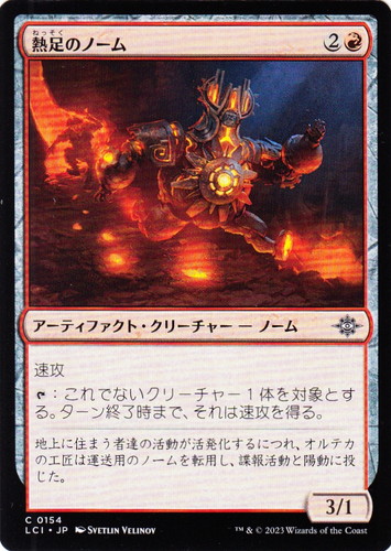 ![]() ![]() | LCI 0154 熱足のノーム アーティファクト・クリーチャー イクサラン:失われし洞窟 C 色:赤 サブタイプ:ノーム マナコスト:(2)(赤) パワー:3 タフネス:1 速攻 [T]:これでないクリーチャー1体を対象とする。ターン終了時まで、それは速攻を得る。 地上に住まう者達の活動が活発化するにつれ、オルテカの工匠は運送用のノームを転用し、諜報活動と陽動に投じた。 illust:SVETLIN VELINOV |