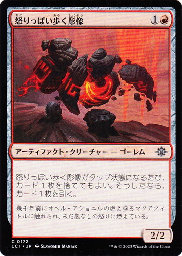 ![]() ![]() | LCI 0172 怒りっぽい歩く彫像 アーティファクト・クリーチャー イクサラン:失われし洞窟 C 色:赤 サブタイプ:ゴーレム マナコスト:(1)(赤) パワー:2 タフネス:2 怒りっぽい歩く彫像がタップ状態になるたび、カード1枚を捨ててもよい。そうしたなら、カード1枚を引く。 幾千年前にオヘル・アショニルの燃え盛るマクアフィトルに触れられ、未だ底なしの怒りに燃えている。 illust:SLAWOMIR MANIAK |