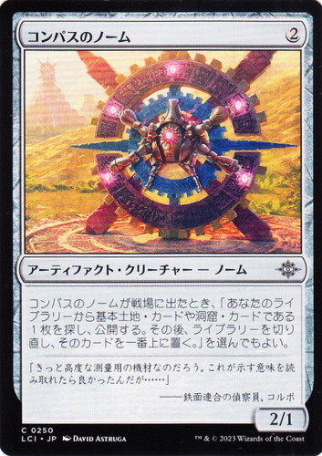 ![]() ![]() | LCI 0250 コンパスのノーム アーティファクト・クリーチャー イクサラン:失われし洞窟 C 色:無色 サブタイプ:ノーム マナコスト:(2) パワー:2 タフネス:1 コンパスのノームが戦場に出たとき、「あなたのライブラリーから基本土地・カードや洞窟・カードである1枚を探し、公開する。その後、ライブラリーを切り直し、そのカードを一番上に置く。」を選んでもよい。 「きっと高度な測量用の機材なのだろう。これが示す意味を読み取れたら良かったんだが・・・・・・」 ――鉄面連合の偵察員、コルボ illust:DAVID ASTRUGA |