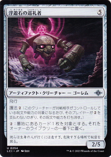 ![]() ![]() | LCI 0254 浮遊石の巡礼者 アーティファクト・クリーチャー イクサラン:失われし洞窟 C 色:無色 サブタイプ:ゴーレム マナコスト:(5) パワー:2 タフネス:5 飛行 護法(2)(このクリーチャーが対戦相手がコントロールしている呪文や能力の対象になるたび、そのプレイヤーが(2)を支払わないかぎり、その呪文や能力を打ち消す。) (2):墓地にあるカード1枚を対象とする。それをオーナーのライブラリーの一番下に置く。 彼らは生身の人が行くには遠すぎ、危険すぎる場所で秘密を探る。 illust:IZZY |