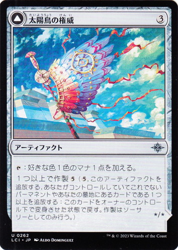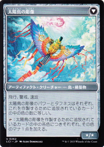 ![]() ![]() | LCI 0262 太陽鳥の彫像 アーティファクト・クリーチャー イクサラン:失われし洞窟 U 色:無色 サブタイプ:鳥・構築物 パワー:* タフネス:* 飛行、警戒、速攻 太陽鳥の彫像のパワーとタフネスはそれぞれ、これを作製するために追放されているカードの中の色の数に等しい。 [T]:太陽鳥の彫像を作製するために追放されているカードの中の各色につきそれぞれ、その色のマナ1点を加える。 両面:太陽鳥の権威 illust:ALDO DOMINGUEZ |