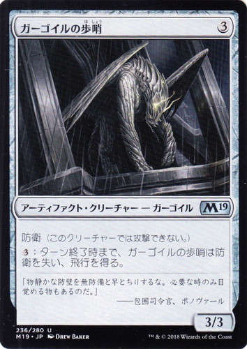 ![]() ![]() | M19 236 ガーゴイルの歩哨 アーティファクト・クリーチャー 基本セット2019 U 色:無色 サブタイプ:ガーゴイル マナコスト:(3) パワー:3 タフネス:3 防衛(このクリーチャーでは攻撃できない。) (3):ターン終了時まで、ガーゴイルの歩哨は防衛を失い、飛行を得る。 「物静かな防壁を無防備と早とちりするな。必要な時のみ目覚める物もあるのだ。」 ――包囲司令官、ボノヴァール illust:DREW BAKER |