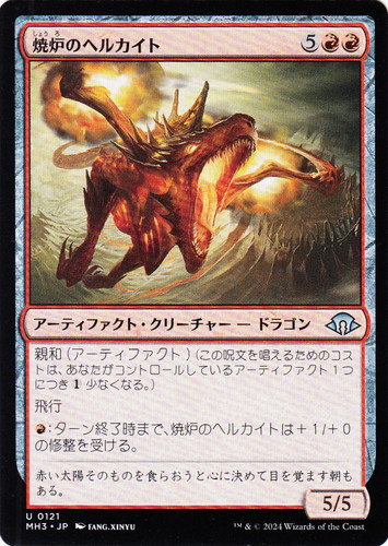![]() ![]() | MH3 0121 焼炉のヘルカイト アーティファクト・クリーチャー モダンホライゾン3 U 色:赤 サブタイプ:ドラゴン マナコスト:(5)(赤)(赤) パワー:5 タフネス:5 親和(アーティファクト)(この呪文を唱えるためのコストは、あなたがコントロールしているアーティファクト1つにつき(1)少なくなる。) 飛行 (赤):ターン終了時まで、焼炉のヘルカイトは+1/+0の修整を受ける。 赤い太陽そのものを食らおうと心に決めて目を覚ます朝もある。 illust:FANG. XINYU |