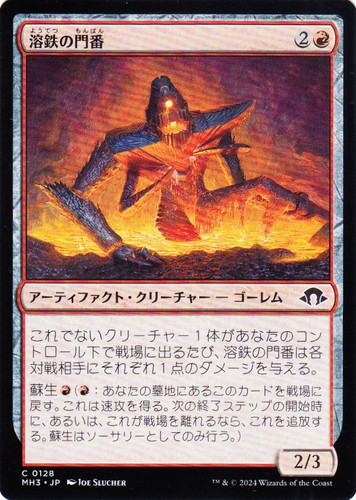 ![]() ![]() | MH3 0128 溶鉄の門番 アーティファクト・クリーチャー モダンホライゾン3 C 色:赤 サブタイプ:ゴーレム マナコスト:(2)(赤) パワー:2 タフネス:3 これでないクリーチャー1体があなたのコントロール下で戦場に出るたび、溶鉄の門番は各対戦相手にそれぞれ1点のダメージを与える。 蘇生(赤)((赤):あなたの墓地にあるこのカードを戦場に戻す。これは速攻を得る。次の終了ステップの開始時に、あるいは、これが戦場を離れるなら、これを追放する。蘇生はソーサリーとしてのみ行う。) illust:JOE SLUCHER |