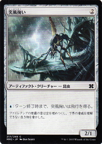 ![]() ![]() | MM2 217 突風掬い アーティファクト・クリーチャー モダンマスターズ2015 C 色:無色 サブタイプ:昆虫 マナコスト:(2) パワー:2 タフネス:1 (青):ターン終了時まで、突風掬いは飛行を得る。 ファイレクシアの煙霧の雲は空を埋めつくし、外界の脅威を理解できない生き物を脅かした。 illust:DAN SCOTT |