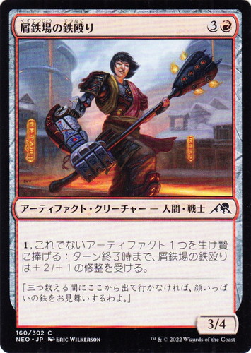 ![]() ![]() | NEO 160 屑鉄場の鉄殴り アーティファクト・クリーチャー 神河:輝ける世界 C 色:赤 サブタイプ:人間・戦士 マナコスト:(3)(赤) パワー:3 タフネス:4 (1), これでないアーティファクト1つを生け贄に捧げる:ターン終了時まで、屑鉄場の鉄殴りは+2/+1の修整を受ける。 「三つ数える間にここから出て行かなければ、顔いっぱいの鉄をお見舞いするわよ。」 illust:ERIC WILKERSON |