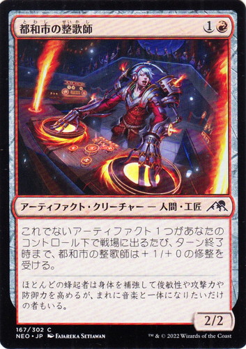 ![]() ![]() | NEO 167 都和市の整歌師 アーティファクト・クリーチャー 神河:輝ける世界 C 色:赤 サブタイプ:人間・工匠 マナコスト:(1)(赤) パワー:2 タフネス:2 これでないアーティファクト1つかあなたのコントロール下で戦場に出るたび、ターン終了時まで、都和市の整歌師は+1/+0の修整を受ける。 ほとんどの蜂起者は身体を補強して俊敏性や攻撃力や防御力を高めるが、まれに音楽と一体になりたいだけの者もいる。 illust:FAJAREKA SETIAWAN |